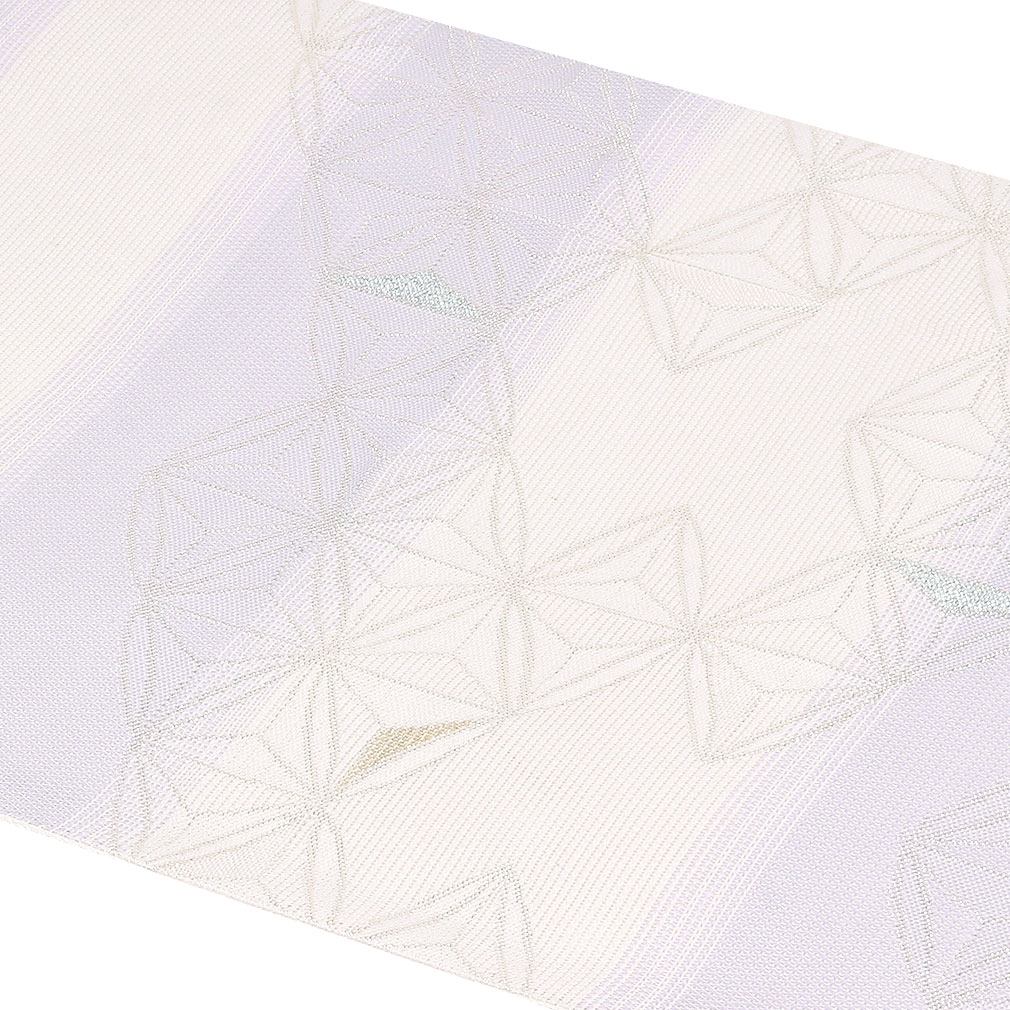 オフホワイトとラベンダー色の横段に麻の葉柄を織り込んだ上品な袋帯です。