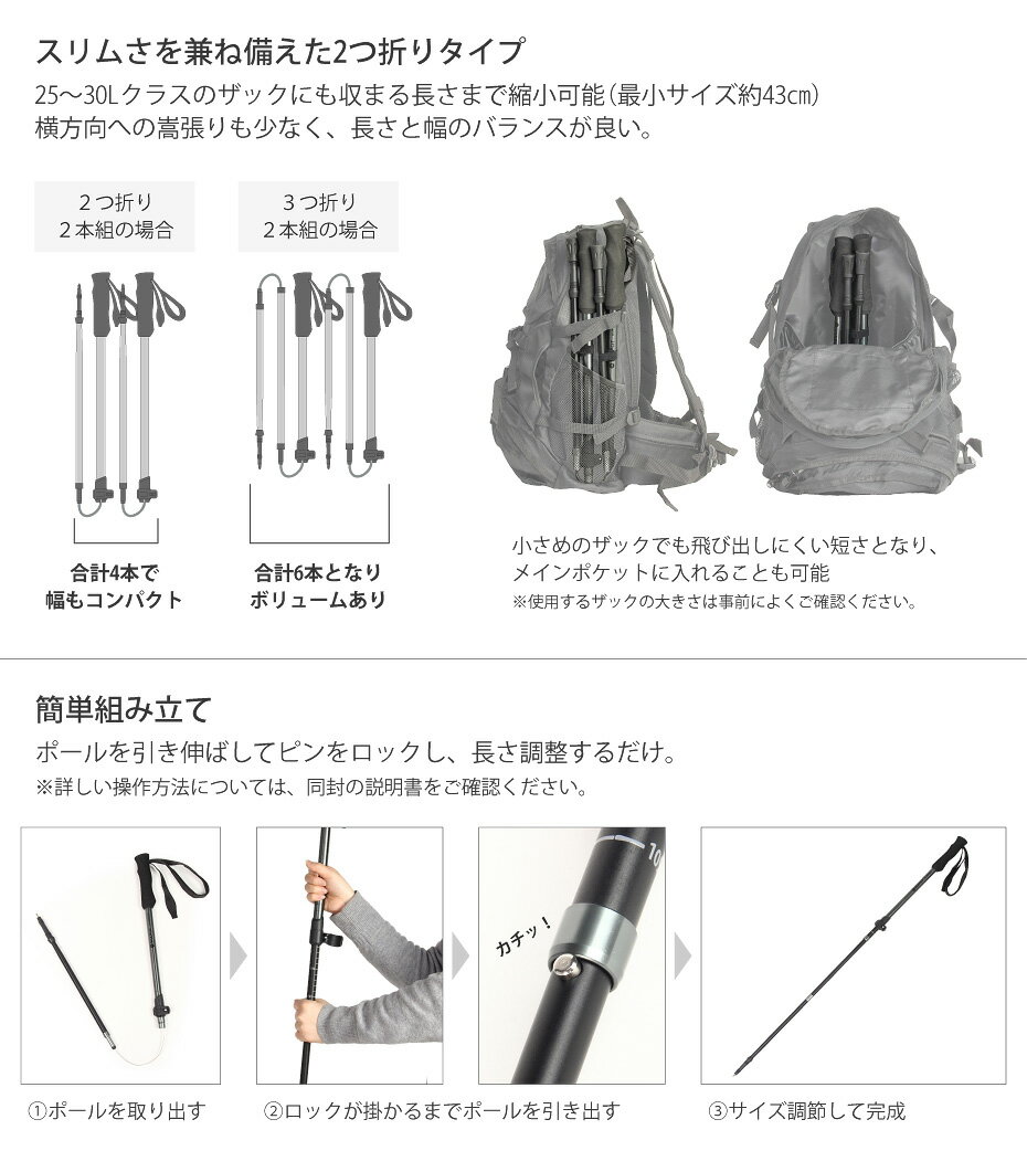 折りたたみタイプ なので トレッキングポール を使わない場面では小さく収納でき、持ち運びも便利。