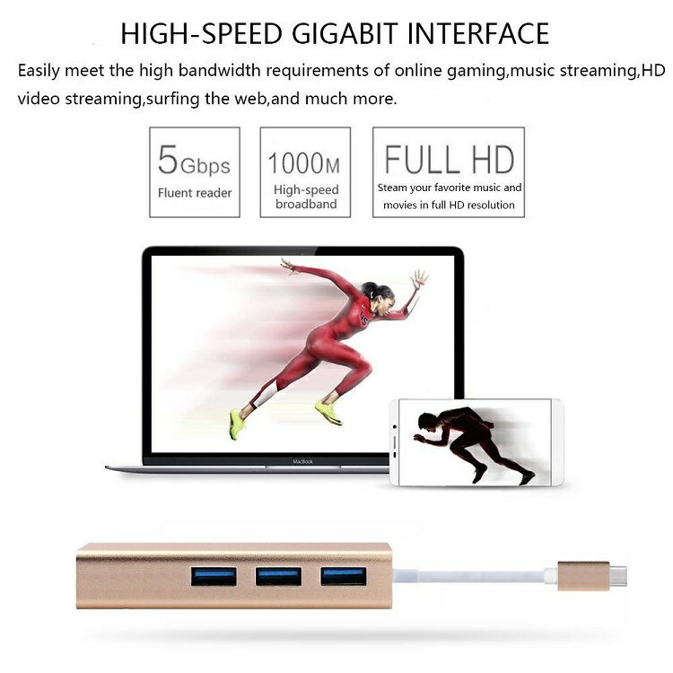 製品仕様 商品名 Type C to 3ポート USB3.0 ハブ付 ハイスピード ギガビット 有線 LANアダプタ カラー シルバー、ローズゴールド スペック 長さ:28cm USB端子:USB3.1 Type-C オス USB3.0 Type-A メス×3ポート メス LANポート:RJ45×1ポート LAN転送速度:10/100/1000Mbps対応 USB転送速度:5Gbps(理論値) 用途 ☆