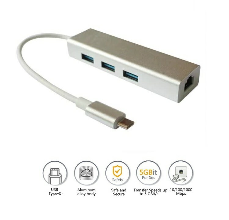 送料無料 Windows/MacBook用 USB3.1 Type C to 3ポート USB3.0ハブ付 ハイスピード イーサネット 有線 LANアダプタ/ USB-C マルチファンクション 10/100/1000BASE-T ギガビット イーサネット RJ45 LAN アダプタ (ホワイト、シルバー、ローズゴールド)3カラー選択
