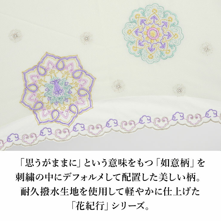 サイズ ・全長:24〜52cm ・親骨の長さ:50cm×7本骨 ・開いた時の直径:85cm・重さ(外袋含まず本体のみ):235g 素材 生地:ポリエステル100%、ウレタンコーティング 親骨:GFRP(グラスファイバー入り強化樹脂)アルミ、ポリ樹脂 中棒:アルミ、鉄、黒塗装 手元:木製 ・手開き(指挟み防止機構) ・ウレタンコーティング加工(UVカット、遮熱、遮光) ・防撥水加工(晴雨兼用) ・MADE IN CHINASPEC 商品名 花紀行シリーズ「如意刺繍 ミニ折りたたみ日傘」 サイズ 全長 24〜52cm/直径 85cm/親骨 50cm/骨本数 7本/重さ 約265g 素 材 表生地 ポリエステル 裏生地 ポリエステル(ウレタンコーティング) 親骨 GFRP(グラスファイバー入り強化樹脂) 中棒 アルミ・黒塗装 手元 木製 機能性 開閉機構 手開き UVカット率 99.9%(UVA,UVB全域の平均値) 紫外線透過率 0% (UVA、UVB中間点)※数値は生地検査 遮光率 100%完全遮光 撥水加工(晴雨兼用) 二重張り ブランド:花紀行日本企画 日本品質基準(JUPA基準) 日本企業中国工場生産