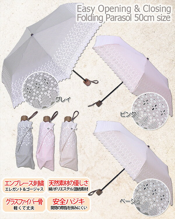 ベージュ・ピンクで約83%です(反物の段階での数値測定) ■晴れの日専用の日傘です (※注)生地には防水加工を施していますが刺繍部分から雨が漏れる可能性があります ■アルミとグラスファイバーの骨を使用し重さは約245g。